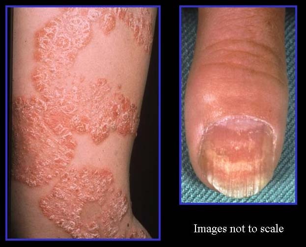 - kelainan kuku atau lesi kulit karena psoriasis (kulit menjadi bersisik-sisik kemerahan dan terjadi penebalan, bisa disertai kuku yang berlubang)