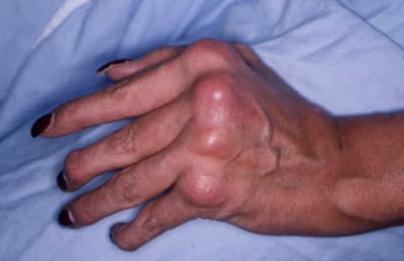 - pembengkakan dan nyeri persendian (artritis), biasanya pada persendian jari tangan dan jari kaki, tetapi bisa juga pada persendian lainnya